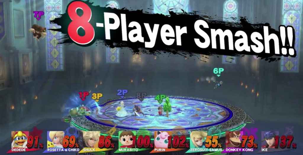 First off, 8-PLAYER SMASH IS COMING. A new multiplayer mode where up to 8 people can play at once, so you won’t feel like the 5th wheel anymore. Or the 6th, or 7th or 8th for that matter. This is pretty big, and changes lots of things for both the series and the fighting game genre as a whole. Any kind of fighting game tournament can choose to use this mode for more creative competitions, and it just looks insane to be playing this with friends. Seeing as the GameCube controller adapter only has four ports, the latter four controllers will probably be using a Nintendo 3DS, Gamepad, Wiimote, Pro Controller, or other wireless alternative. Also, there will be several much larger stages fit for 8 players to fight on, but not every stage will allow for 8-Player Smash. New stages include The Great Cave Offensive from Kirby Super Star, Big Battlefield, Palutena’s Temple, Hyrule Temple, and Jungle Hijinx- a stage with both a foreground and background to play on!!