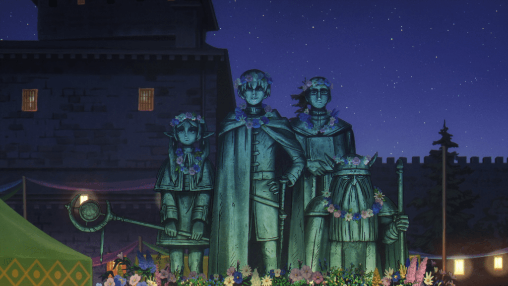 One of the most instantly striking things about the series is that it takes these seemingly limiting aspects like the Tolkien and RPG tropes and instead of being hindered by them, utilizes them to not only explore the possibilities of such a premise but also our own reality through this fantastical lens. Much of this manifests in the character of Frieren and her nature as an essentially immortal elf. Through her, the question of what life entails after the great adventure ends becomes infinitely more pronounced. At the same time, the ephemerality of human life is most effectively examined from the perspective of someone who experiences it as an observer rather than its subject.