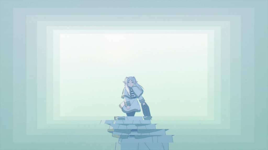 Although the series has so much going on, the openings and endings still deserve acknowledgment. We open with the unmistakable style of the tremendously popular YOASOBI, an odd fit for Frieren from a first impression, but as is standard for YOASOBI, the lyrics speak directly to the story itself. Additionally, the song grows in association with the series to become an iconic representation of it, especially in its livelier moments. It’s balanced out by the other theme songs matching the slower vibe that many may expect, including its equally excellent successor by Yorushika. Both opening sequences are storyboarded and directed by the captain of the ship Saitou himself, a pair of tautly woven encapsulations of the series and its themes. The former culminates in a brilliant visual metaphor of Frieren bridging her past and present together, while the latter matches the tonal shifts of the series proper to the varied intensity of the song, complete with a painterly, heavily pronounced expression of its signature textures.